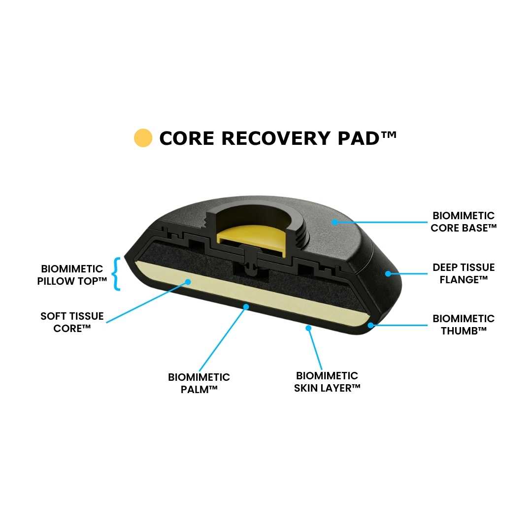 - Core Recovery Applicator Pad – Soft, skin-like surface that mimic the metrics of a human hand, designed to conform to the body for enhanced comfort